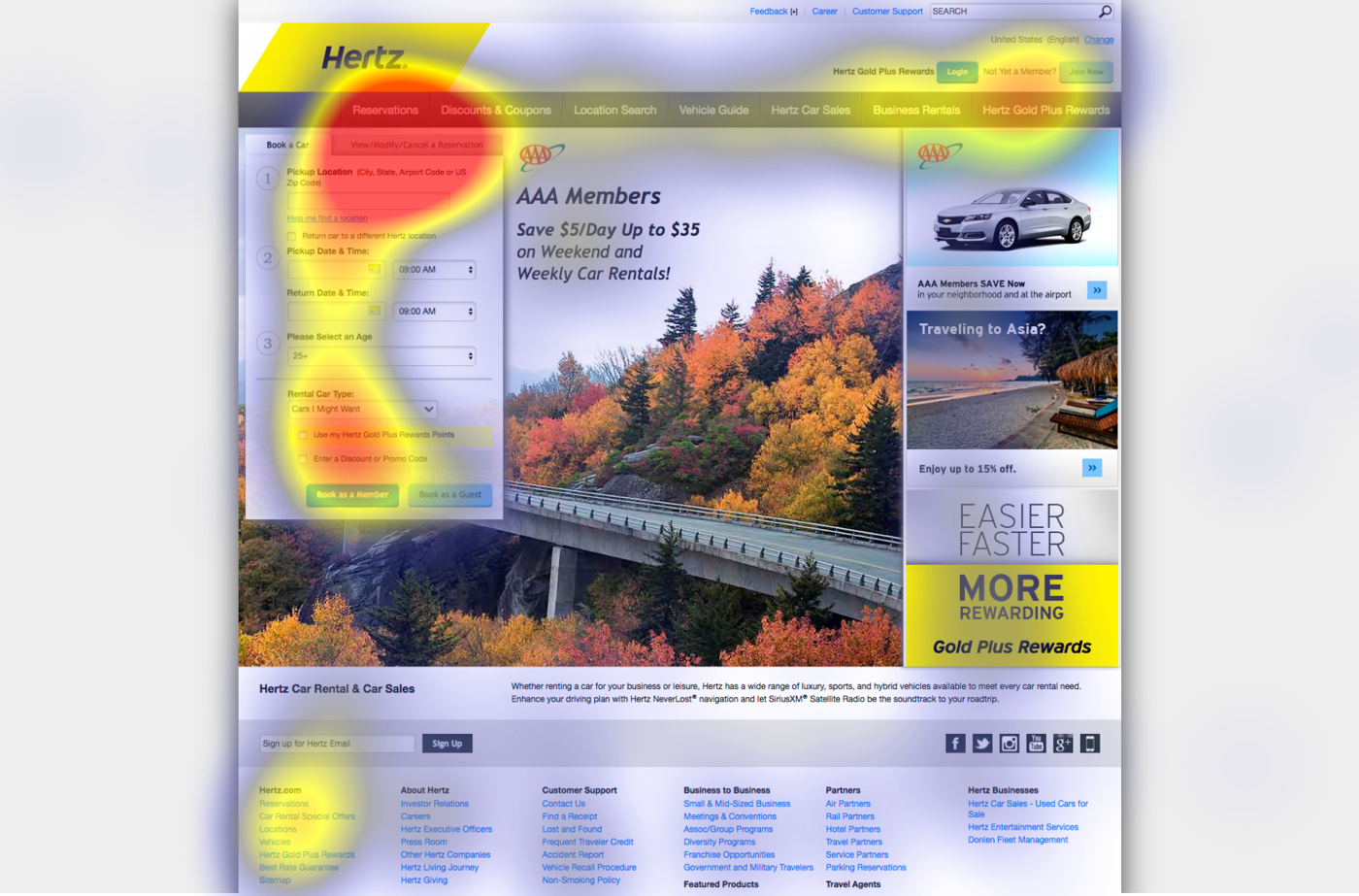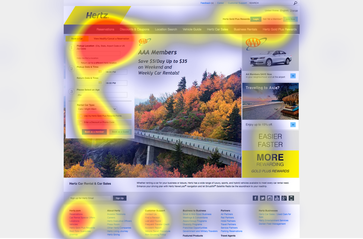 Hertz 主页的弱指示符版本:除了关注目标标签外,这个热图显示了很多集中在页脚链接、促销项目以及在目标标签附近的预订表单上的其他项目。对页面页脚的关注增加尤其令人不安,因为这个信号表明用户已经变得非常绝望了。