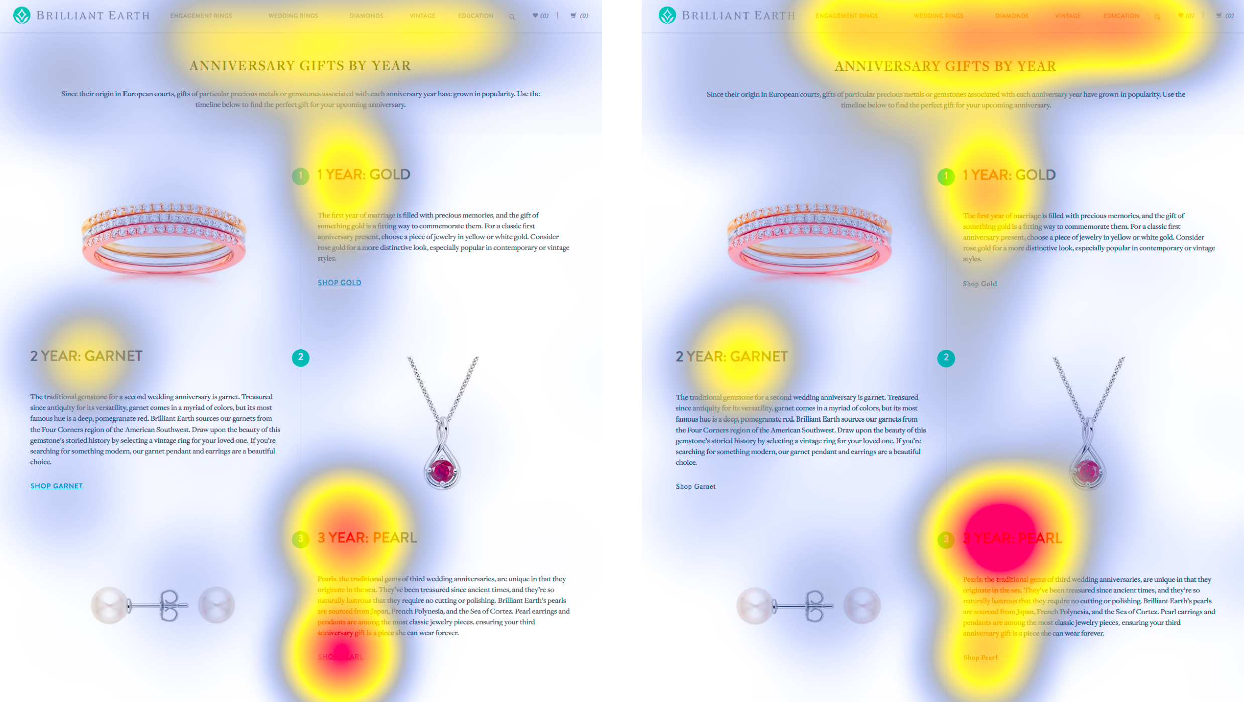 Brilliant Earth:强指示符版(左)的热图显示,参与者将注意力集中在感兴趣的区域上,并将注意力集中在目标链接上。相比之下,弱指示符版(右)的热图显示,尽管大多数的注意力都集中在珍珠珠宝部分,但它们主要集中在标题上,而不是目标链接上。