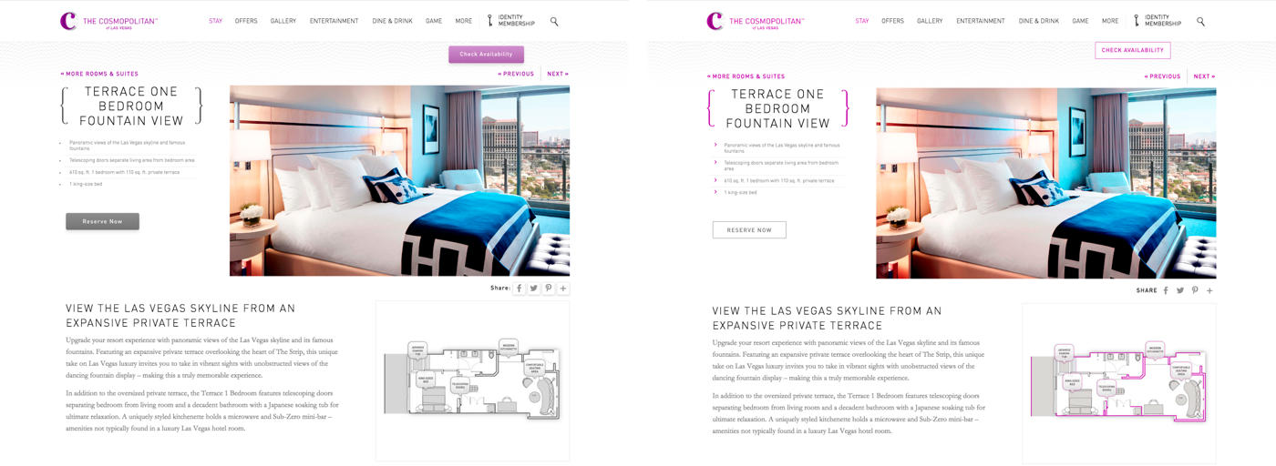 酒店房间的某个具体页面的两个修改版本:具有强指示符的版本(左)包含了具有轻微 3D 样式按钮,而淡紫色的颜色只在交互元素上使用;而具有弱指示符的版本(右)则是扁平化的按钮。