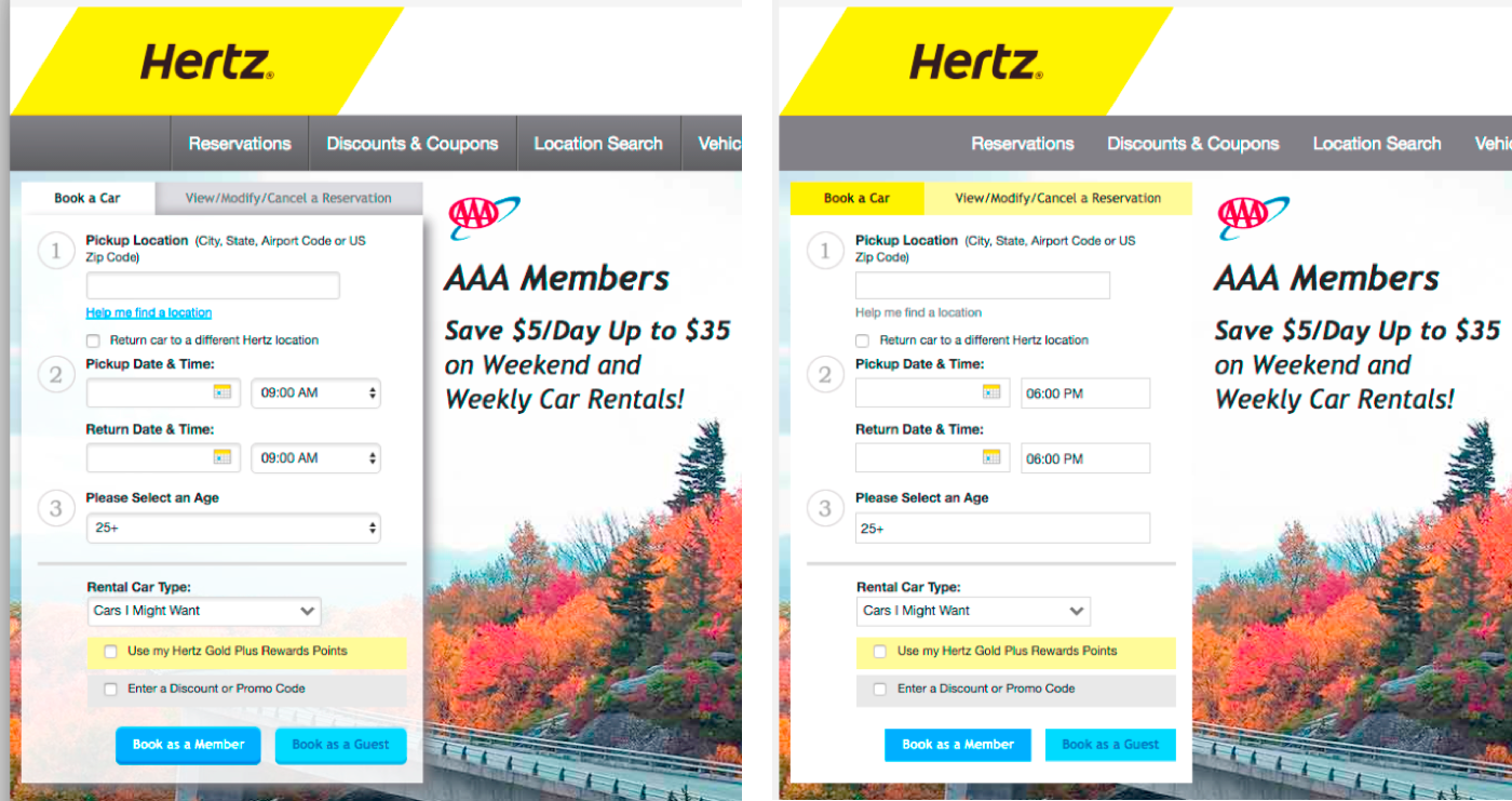 Hertz 主页:关闭目标标签(查看、修改、取消预订)的强(左)和弱(右)指示符版本的局部放大图