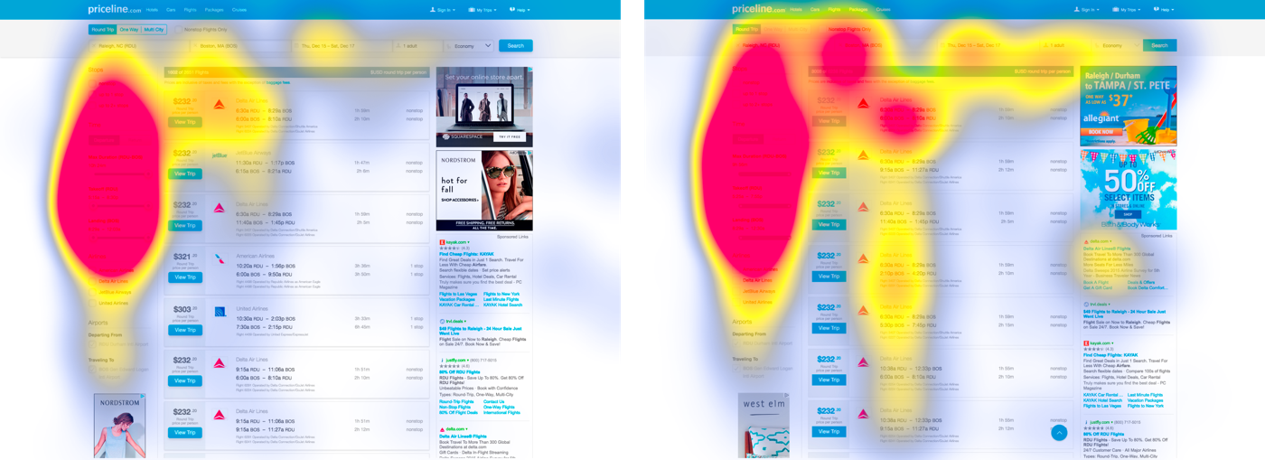 Priceline 的搜索结果:强指示符版(左)显示了凝视在目标元素之上(出发时间的滑动条)。弱指示符版(右)显示了一个更大的「热」区域,这表明在页面中,凝视的分布更加均匀。