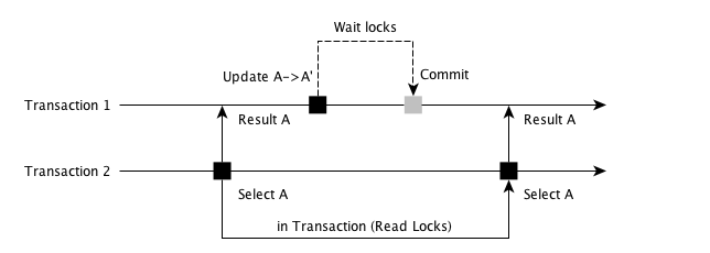 如上所示,当 Transation 2 读取 A 时候,会同时加上一把 Read Lock,这把锁会阻止 Transaction 1 将 A 更新为 A’,Transaction 1 要么选择等待,要么就选择结束。