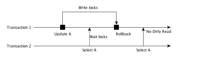 如上图所示,Transaction 1 在写操作时候,对数据 A 加了写锁,那么 Transaction 2 想要读取 A,就必须等待这把锁释放。这样就避免当前事务读取其他事务的未提交数据。