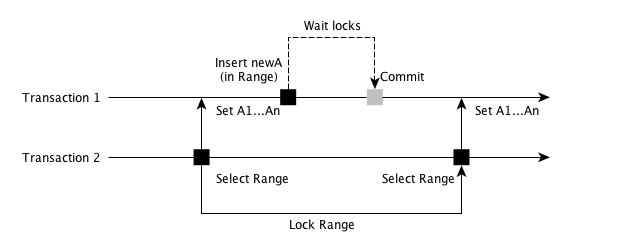 如图所示,在上述操作中,Transaction 2 查询了一个范围 Range 之后,Transaction 1在这个范围内插入了一条新的数据。此时 Transaction 2 再次进行范围查询时候,会发现查询到的 Range 和上次已经不一样了,多了一个 newA。