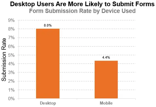 虽然在两种设备之间的浏览量的份额几乎是均衡的,但提交率却不是。桌面端用户在每 100 个表单中有 8个提交,几乎是移动端用户 100 个表单仅 4.4 个提交率的两倍。我们的数据包括各种形式表单的浏览量和提交数,因此我们想要进一步分解这些数据。