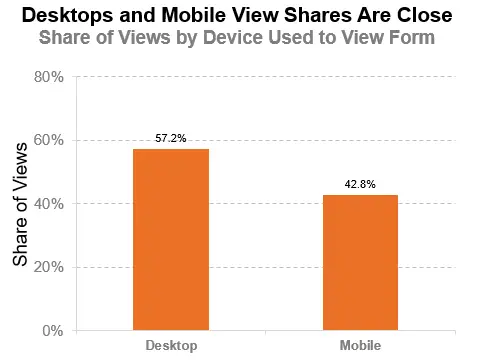 我们想知道人们更常使用什么类型的设备来打开表单。纵观全部浏览量,我们统计了在桌面端上显示的表单数和在移动上显示表单数。然后,将浏览量的总数除以对应设备的总数,从而得到了各平台浏览量所占的份额。