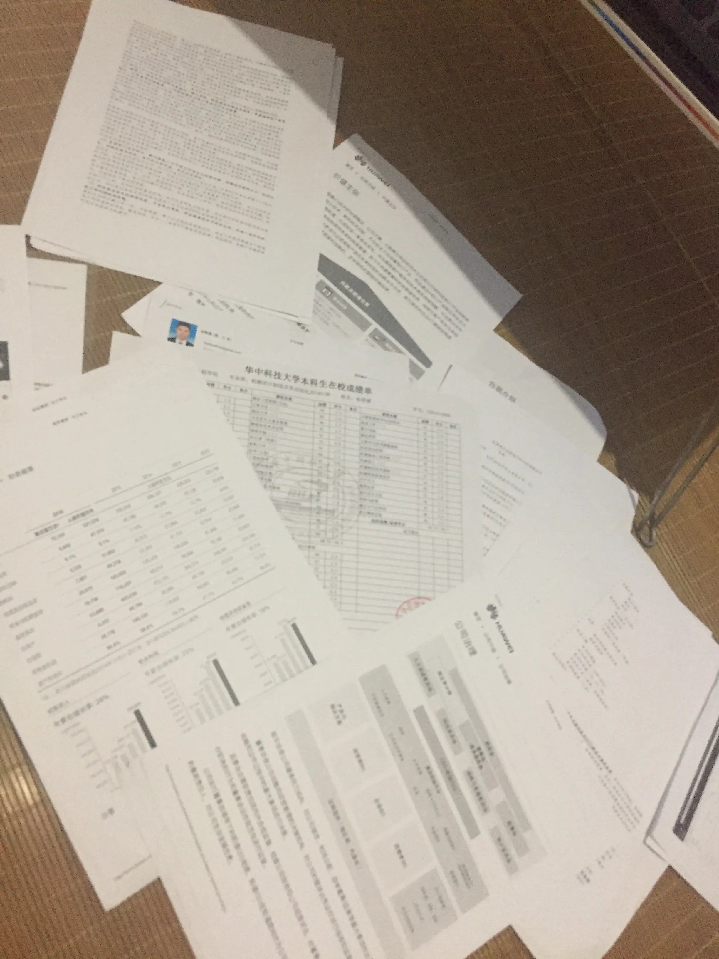 我还说一点我个人的小感悟,那么就是你的个人资料一定要整整齐齐的摆好,最好是像我这样用一个透明的小皮夹子很方便的夹在一起,同时,让技术面试官能够方便的翻页、查找你的资料。同时,资料请务必打成彩色,虽然一块钱一张是有点贵,但是从我的角度来说,彩色耐看太多了。黑白根本没法找到重点。
