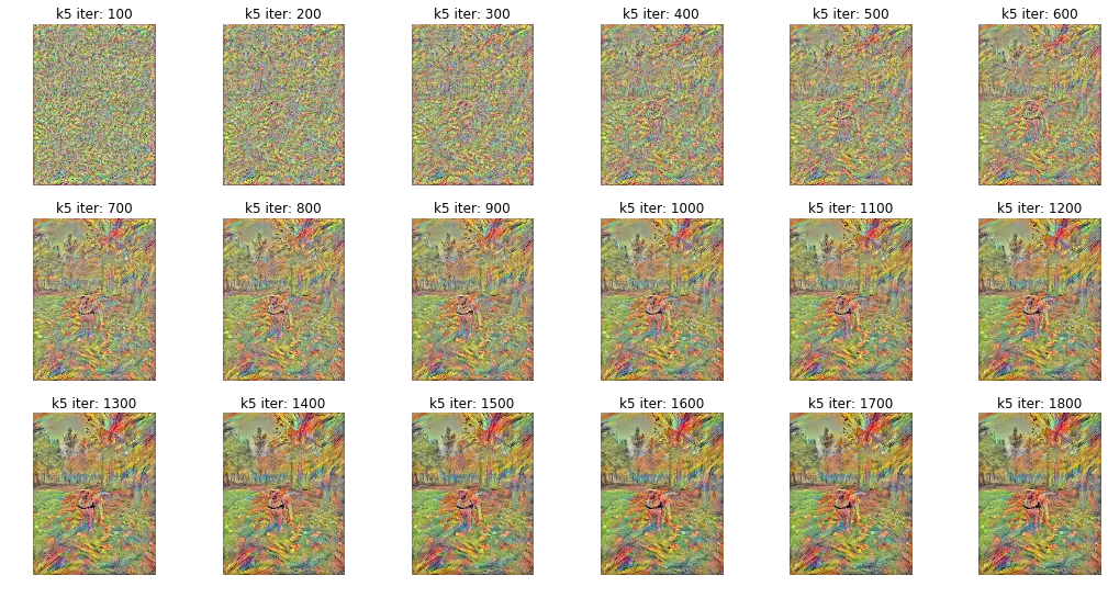 展示从第100次迭代结果到第1800次迭代结果的图像风格化的过程,特征的识别渲染由浅入深的一步一步增强,从edge,到shape。