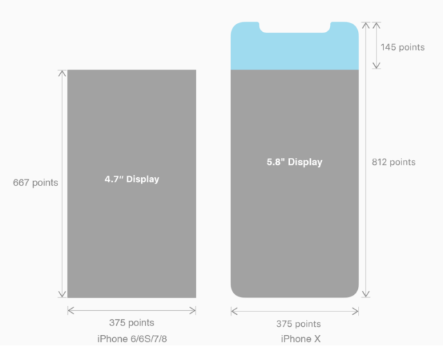 iPhone X 开发尺寸与 iPhone 8的宽度一致,在垂直方向上多了145 pt,这就意味着多出20%的垂直空间, APP 可以展示更多的内容。