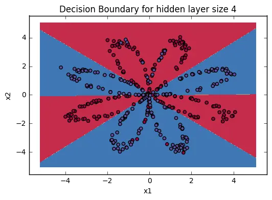 最后的决策边界如下图,在训练数据上的精确度为90%,是不是比logistic regression表现强多啦?可见logistic regression不能学习到数据中的非线性关系,而神经网络可以(哪怕是本例中一个非常浅的神经网络)。