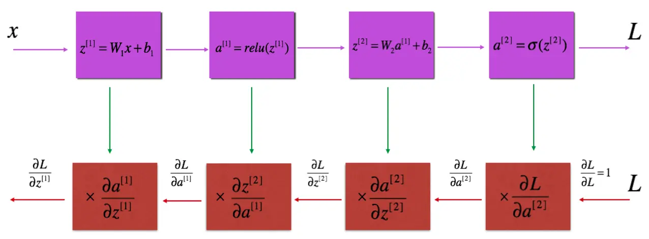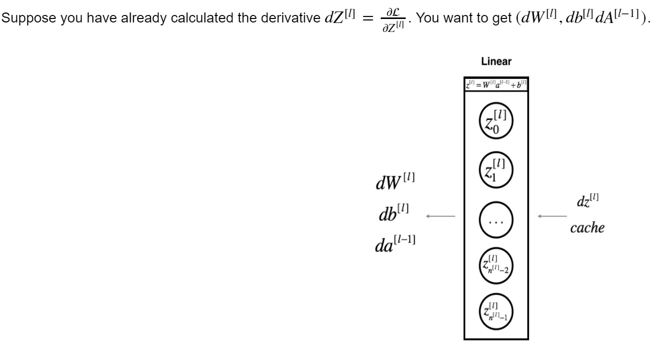 反向传播和前向传播的函数设计是对称的,但是会比前向传播复杂一丢丢,需要小心各种线性代数中的运算规则——这也是为什么在前向传播中我们都在return前加入了维度检查(assert + shape)。下图显示了每一个神经元在反向传播中的输入和输出。现在我们看到之前在前向传播中缓存的用处了。如果我不储存W和Z的值,我就没有办法在反向线性传播中计算dW,db同理。