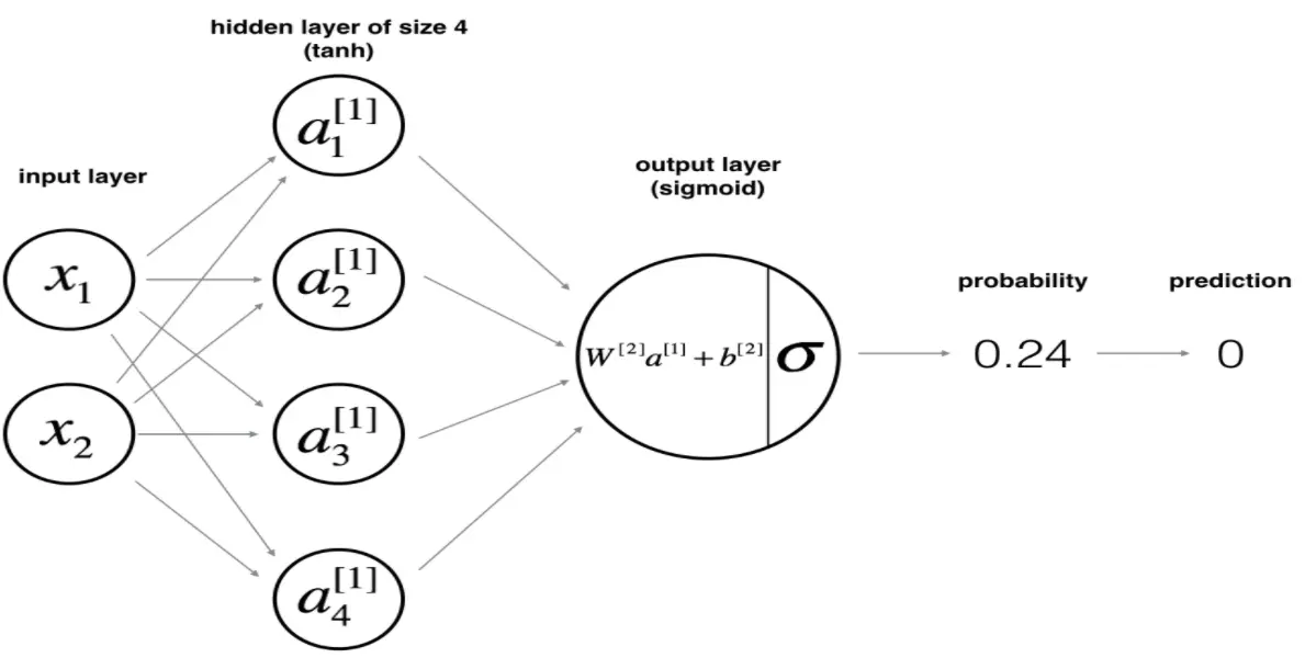第三课的例子是Planar data classification with one hidden layer,即帮助大家搭建一个上图所示的浅神经网络(Shallow Neural Networks):一个4个单元的隐藏层 (tanh) 加一个sigmoid的输出层。