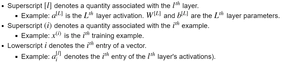 随着神经网络的模型越来越深,我们会有L-1个隐藏层,每一层都用小写的L即[l]标注为上标。z是上一层的输出(即这一层的输入)的线性组合,a是这一层通过激活函数对z的非线性变化,也叫激活值 (activation values)。训练数据中有m个样本,每一个样本都用(i)来标注为上标。每一个隐藏层l里都有n[l](上标内是小写的L不是1)个神经元,每一个神经元都用i标注为下标。