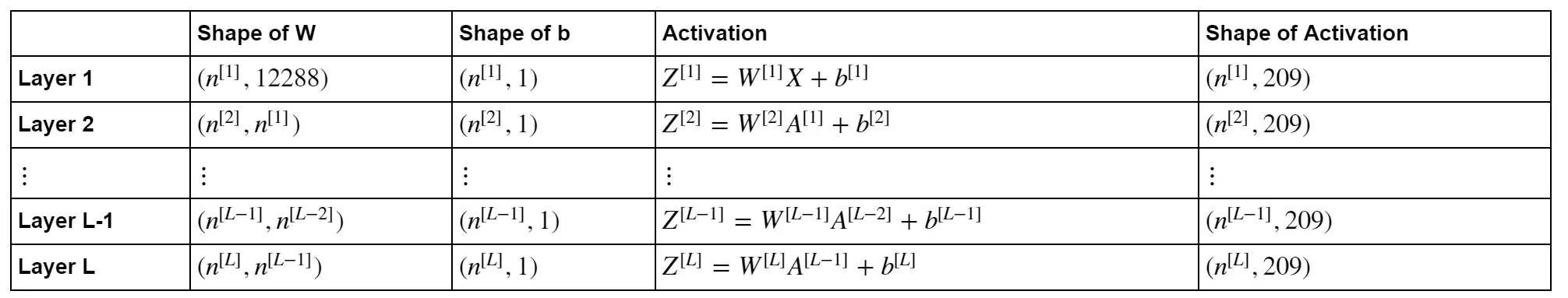 assert(parameters['W' + str(l)].shape == (layer_dims[l], layer_dims[l-1]))