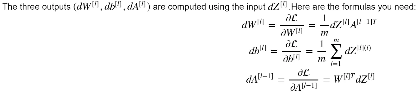 grads["dA" + str(L)], grads["dW" + str(L)], grads["db" + str(L)] = linear_activation_backward(dAL, current_cache, activation = "sigmoid")