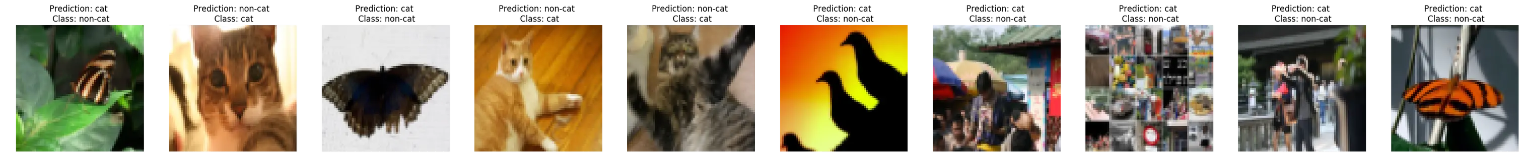 最后我们的模型在训练数据上的精确度为98.6%。然后我们就可以用类似于predict(test_x, test_y, parameters)这样的方法就能预测这个图片是不是一个喵喵啦!最后得到在训练数据上的精确度为80%,但是让我们来看看剩下20%没有正确预测的样本是什么样子的……