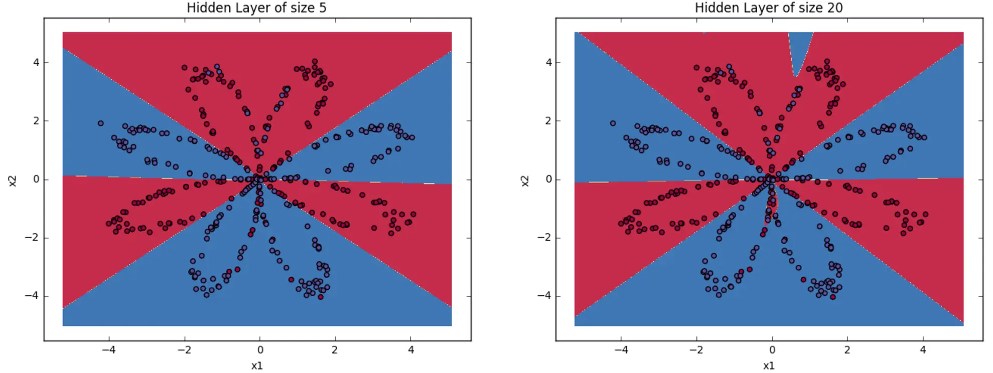 可以看到,在训练数据上,5个神经元的精确度是最高的,而当神经元数超过20时,决策边界就显示有overfitting的情况了。不过没事,之后会学习正则化 (regularization),能使很复杂的神经网络都不会出现overfitting。