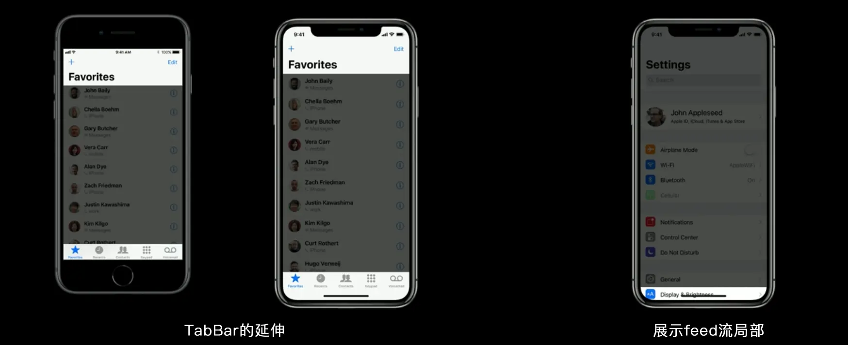 指示灯区域是一个带着系统功能的内容显示区域,这就意味着它可以展示你内容;同时如果你的底部是TabBar,那么指示灯区域背景会来自于TabBar背景的延伸;如果我们是一个feed流的页面,底部则会展示次屏feed流的局部。