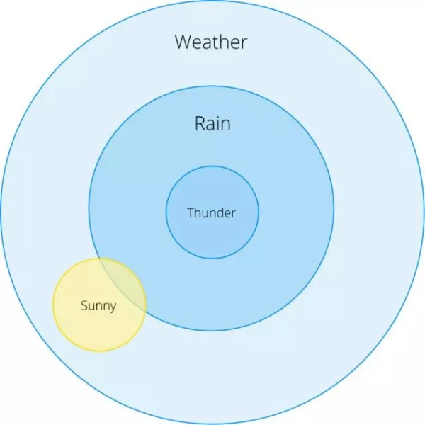 从这个欧拉图,我们可以看到 P(Rain | Thunder)= 1 :当我们看到雷声时,总会下雨(当然,这不完全正确,但是我们在这个例子中保证它成立)。