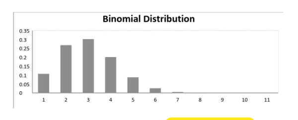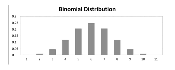 而成功概率和失败概率相等的二项分布看起来如下图所示: