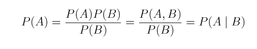 如果我们从右到左阅读上式,我们会发现 P(A | B) = P(A)。这就意味着事件 A 独立于事件 B!P(B)也是一样,独立事件的解释就是这样。