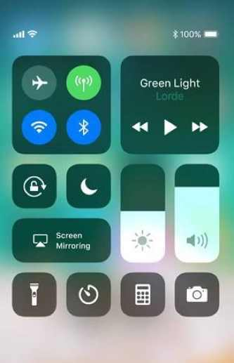 在iOS 11中,控制中心变得更加个性化和人性化。从手机屏幕底部往上滑动即可调出控制中心页面,控制中心不再是半屏,而是整屏。控制中心左上角是蓝牙、无线网等选项,右上角为Apple Music,下方的亮度和音量采取滑动条设计。