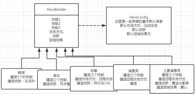 在这里我举一个栗子,就好比王者荣耀中展示一个英雄的效果需要人物技能、回城的效果和皮肤。这里就可以使用Buidler建造者模式将他们和组装过程分离,使得构建过程和部件都可以自由扩展,两者之间耦合可以降到最低。