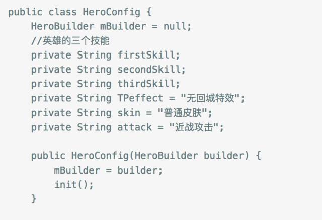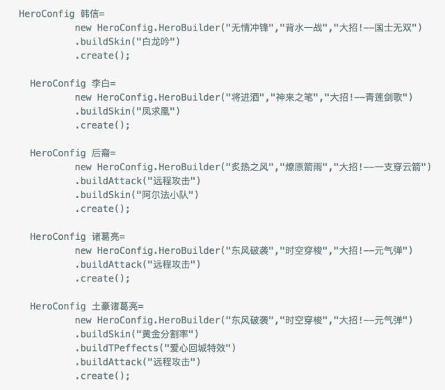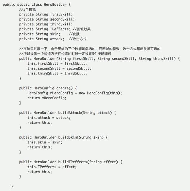 在这里写一个HeroConfig 的静态内部类HeroBuilder。这样就可以实现HeroConfig.HeroBuilder的链式写法了,如下: