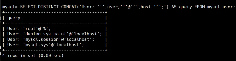 mysql>SELECT DISTINCT CONCAT('User: ''',user,'''@''',host,''';') AS query FROM mysql.user;