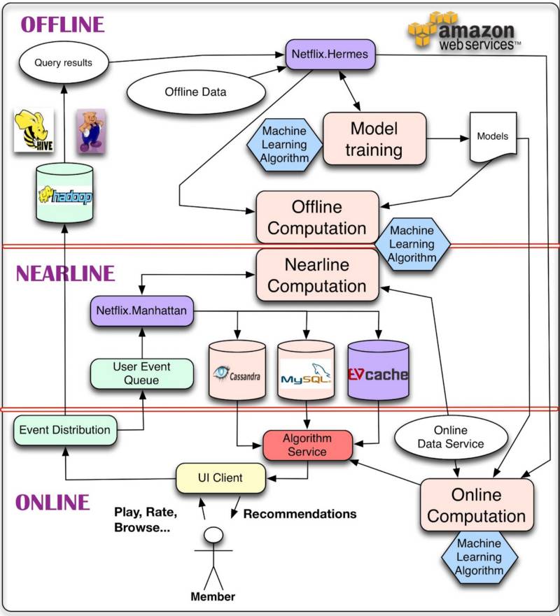 了解了上述常见的传统推荐算法之后,我们已经可以编写了一个不错的推荐系统,然而一个优秀的推荐系统却远远没有这么简单。让我们以Netflix推荐系统为例,来观膜下Netflix推荐系统的架构细节,如下图。Netflix推荐系统由许多种不同的推荐算法组成,其中最为核心两个算法是受限玻尔兹曼机和举证奇异值分解(鉴于他们的复杂性和篇幅限制,我们没有在前面的算法原理章节介绍他它们),它们均属于协同过滤算法的范畴,我们可以衍生的理解他们工作特点。Netflix推荐系统存在三种不同的工作方式:离线模式,近线模式和在线模式。特别地,其中的在线模式中算法服务模块负责对不同推荐算法的应用策略。