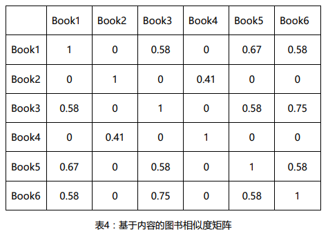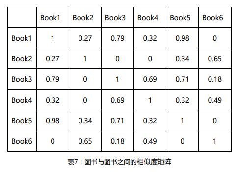 同上,分别计算所有图书与图书之间的相似度可以得到一个图书间的相似矩阵。