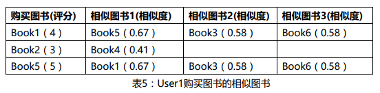 以对User1进行推荐为例,根据用户对图书的评分矩阵(表2),选取User1此前评分过的三本图书(Book1,Book2,Book5),分别挑选三本与它们最相似的图书,如下表: