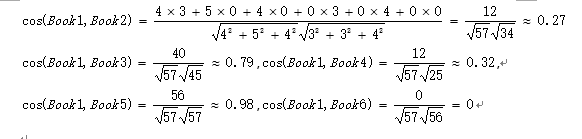 有了每一本书的内容向量矩阵和相似度的度量方法,我们就可以比较书与书之前的相似性了。以第一本书为例,根据余弦相似度公式分别计算Book1与其他各书(Book2,Book3,Book4,Book5,Book6)的相似度。