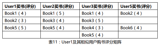 以对User1进行推荐为例,选取与User1最相似的三位用户(相似度为0.75的User2,相似度为0.63的User3,相似度为0.30的User5),分别列举相似用户曾经买过的图书,如下表:
