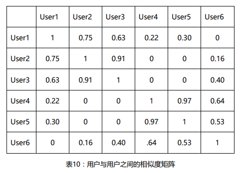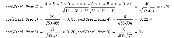 与基于内容的推荐算法类似的,有了每个用户的向量表示矩阵,通过余弦相似度的度量方法,就可以比较书用户与用户之间的相似性了。以User1为例,根据余弦相似度公式分别计算User1与其他用户(User2,User3,User4,User5,User6)的相似度。
