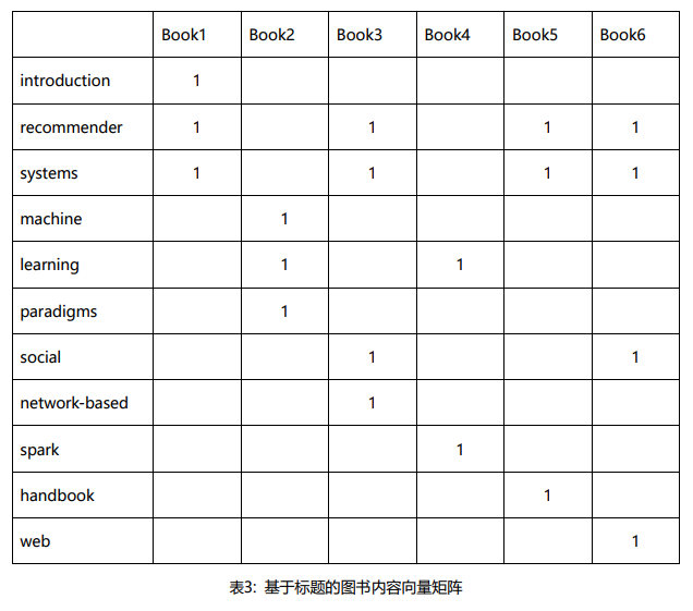 首先,对内容(这里以书名为例)进行数据预处理,找出描述图书的向量表示。鉴于语法词在书名中很常见,忽略内容中语法连接词(to, and, the)。可将6本图书描述成向量矩阵如下:(其中1表示行对应的书中存在列元素对应的词)