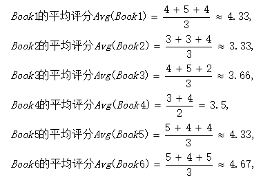 流行度推荐算法根据大众的流行指标(最高评分、最多购买、最多下载、最多观看等)进行推荐。在为具体用户推荐之前,我们需要计算出每个商品的流行指标,对任意一本图书,我们以User1,User2,User3,User4, User5,User6对其评分的平均值作为流行度指标。有: