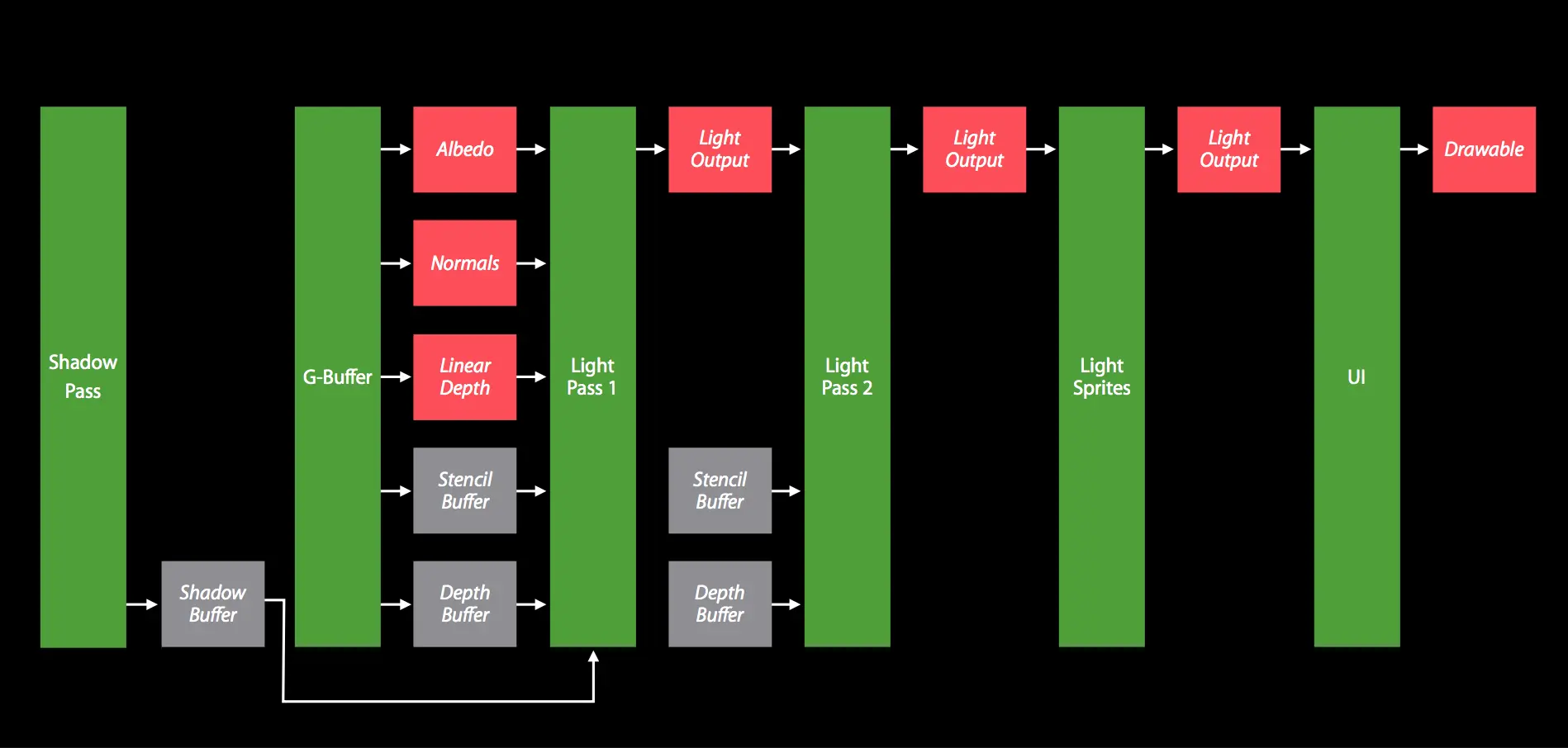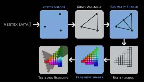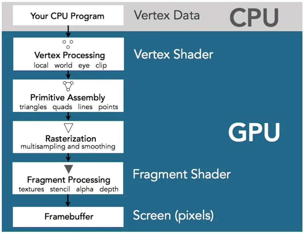 CPU 配置顶点信息 -> GPU 绘制顶点 -> 组装成图元 三角 四边形 线 点 -> 光栅化到像素 -> 片段着色器 纹理 模板 透明度 深度 -> 绘制到屏幕