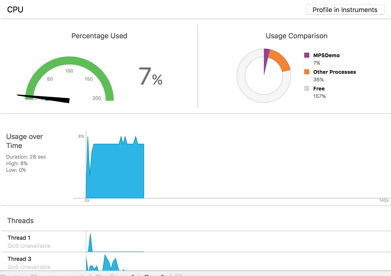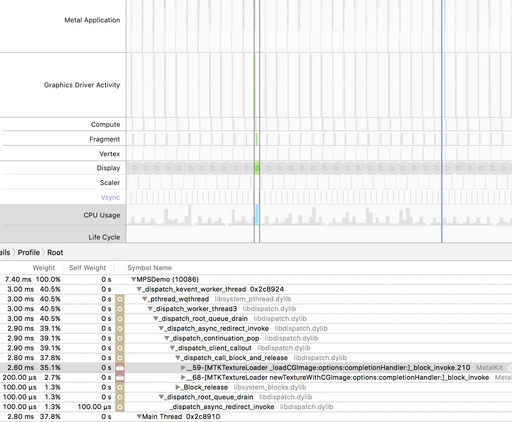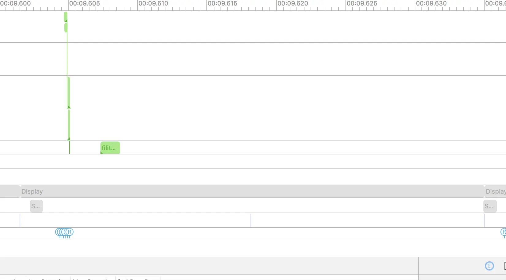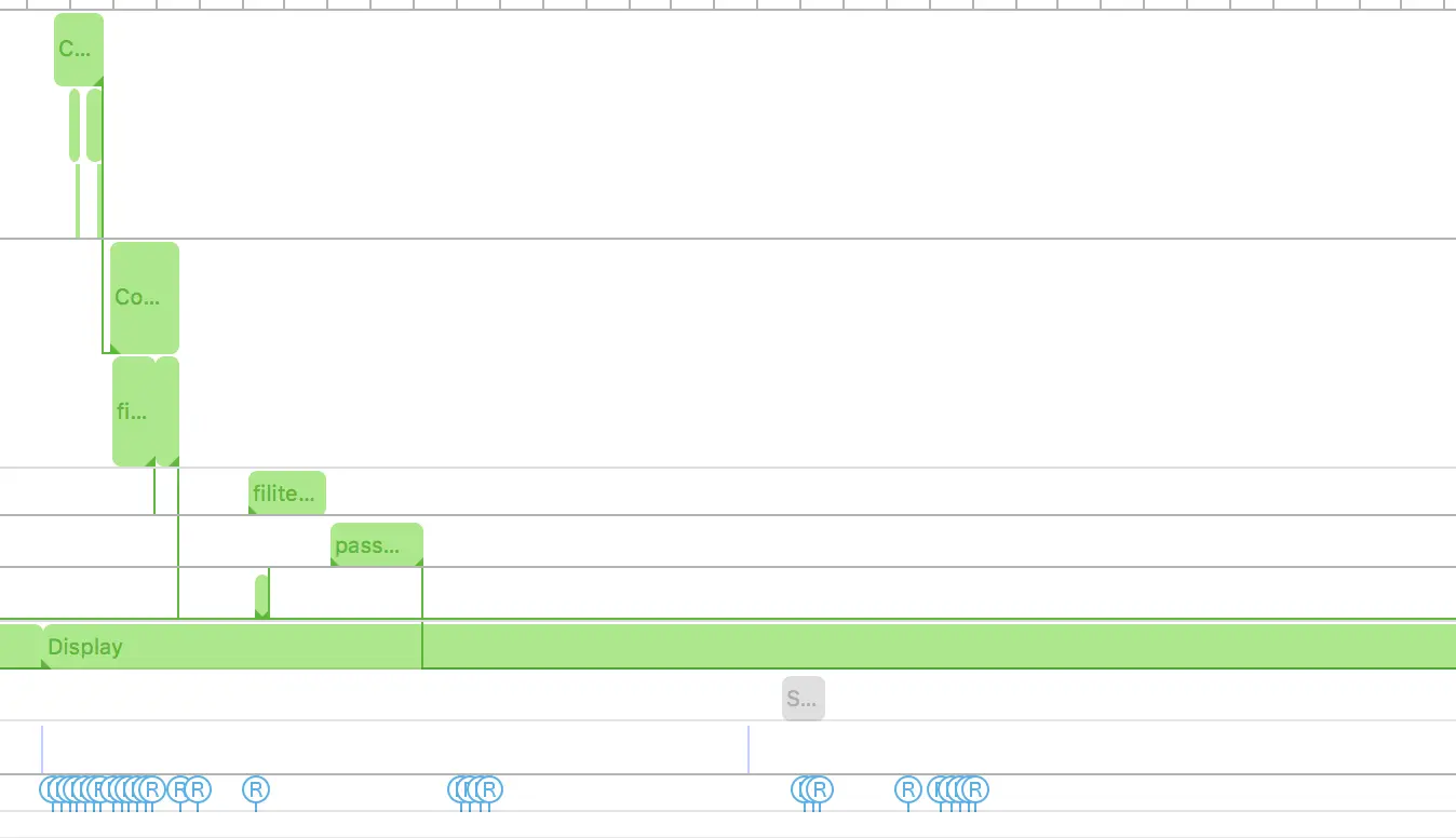 }- shader 的计算优化。在 Metal Performance Trace 中能够看到不同 shader 的计算时间,在这个例子中可以优化的就是滤镜的那个 compute 的 shader,把其中的计算简化,尽量做整数运算并减少运算的次数,把计算的次数减少,方法是配置 threadgroup 时候,需要高度和宽度进行计算,可以使用输出和输入中那个较小那个尺寸进行计算,同样在 shader 中编码的时候,也要注意当前输入的是哪一个尺寸,避免读写到超出尺寸的像素。
