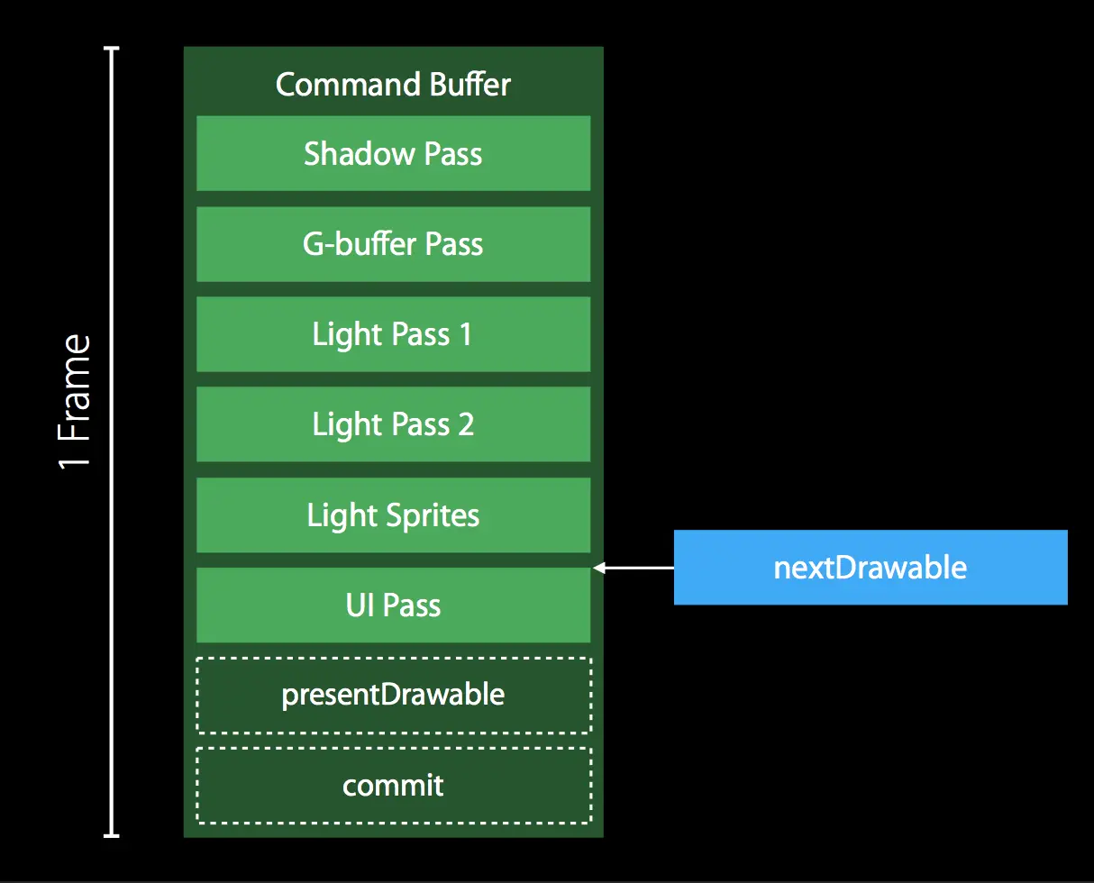 Metal 设计的本身就是线程安全的,所以完全可以在不同线程上 Encoder 同一个 CommandBuffer。将不同的 Encoder 分布在不同的线程上进行,可以大大提高 Metal 的性能。