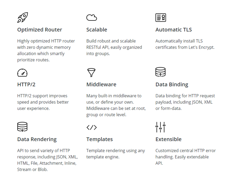 Echo 的宣传语用的是 “高性能,易扩展,极简 Go Web 框架” 。它的一些特性如下图所示: