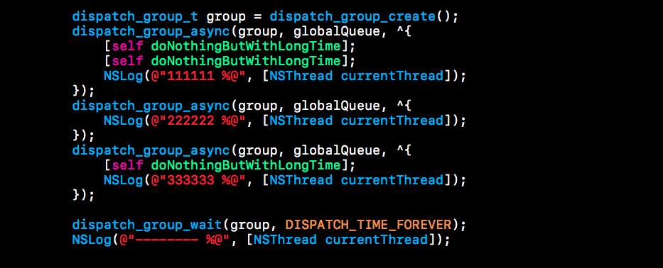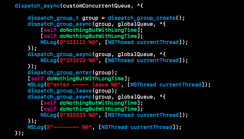 (dispatch_group_enter <-->dispatch_group_leave) enter<-->leave对会阻塞当前线程执行enter<-->leave对之前的blocks会和enter<-->leave对之内的操作同时执行,当enter<-->leave对之间的任务执行完毕当前线程继续执行。