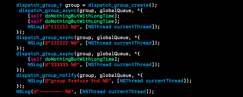 任务组操作,一般在开发中我们不会简单的给每个队列只添加一个任务;对于执行多个任务的队列,串行队列依次按照block添加的顺序执行,这样我们可以在最后的block中做处理;但是对于并发队列因为我们不能确定block的执行顺序,所以我们不能确定blocks执行完毕的处理操作应该放在那里,dispatch_group就是为了解决这样的问题而存在的;dispatch_group将提交到队列的blocks化为一个组,不管执行顺序,等组内的blocks全部执行完毕之后dispatch_group_notify的block会进行回调。
