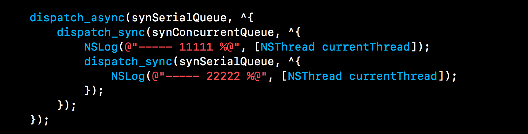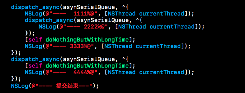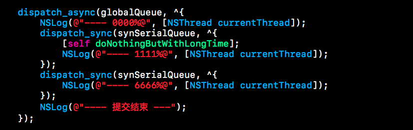 注意:在同步提交时会使用当前的提交线程作为block的执行线程(同步提交未创建新的线程);如果是在主线程提交block,那么block将在主线程上执行,所以这里我使用了异步的嵌套使同步提交在子线程执行。