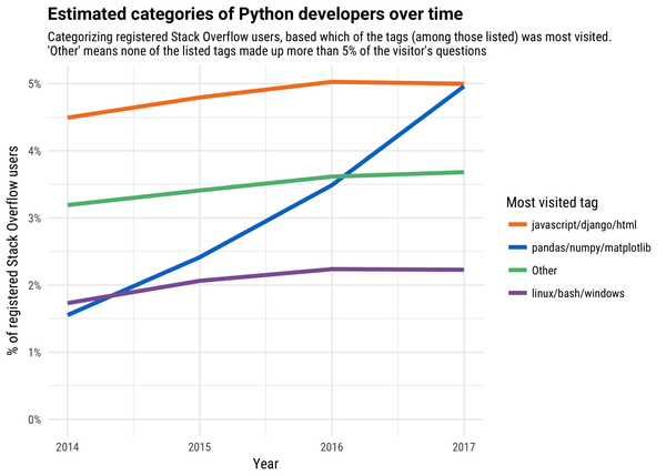 随着时间的推移,哪些类别的Python开发人员变得更加普遍 ?请注意,由于我们对用户进行分类,而不是问题访问,我们将其显示为Stack Overflow注册访问者的百分比(不管他们访问过Python还是访问Python)。