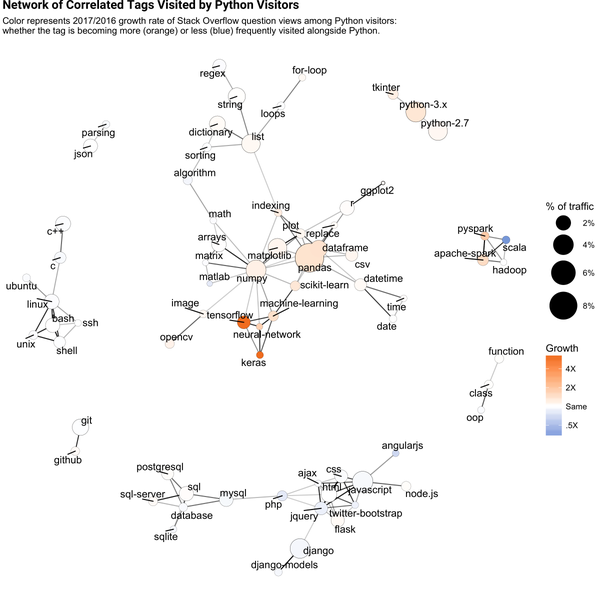 我们还可以通过计算2016年和2017年Python开发人员访问的代码流量来考虑个人标签级别的增长。例如,Javascript流量可能总体稳定,但是它的缩小比例来自Python的访问百分比开发人员。 一旦我们拥有这些每个标签的增长率,将它们放在我们的网络中是有用的,以了解哪些主题正在增长和缩小。