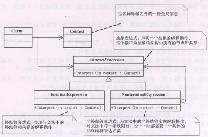 模式特点:给定一个语言,定义它的文法的一种表示,并定义一个解释器,这个解释器使用该表示来解释语言中的句子。