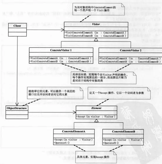 模式特点:表示一个作用于某对象结构中的各元素的操作。它使你可以在不改变各元素的类的前提下定义作用于这些元素的新操作。