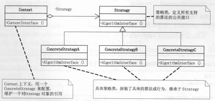 模式特点:定义算法家族并且分别封装,它们之间可以相互替换而不影响客户端。