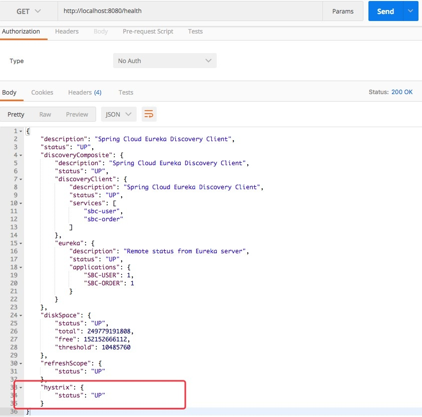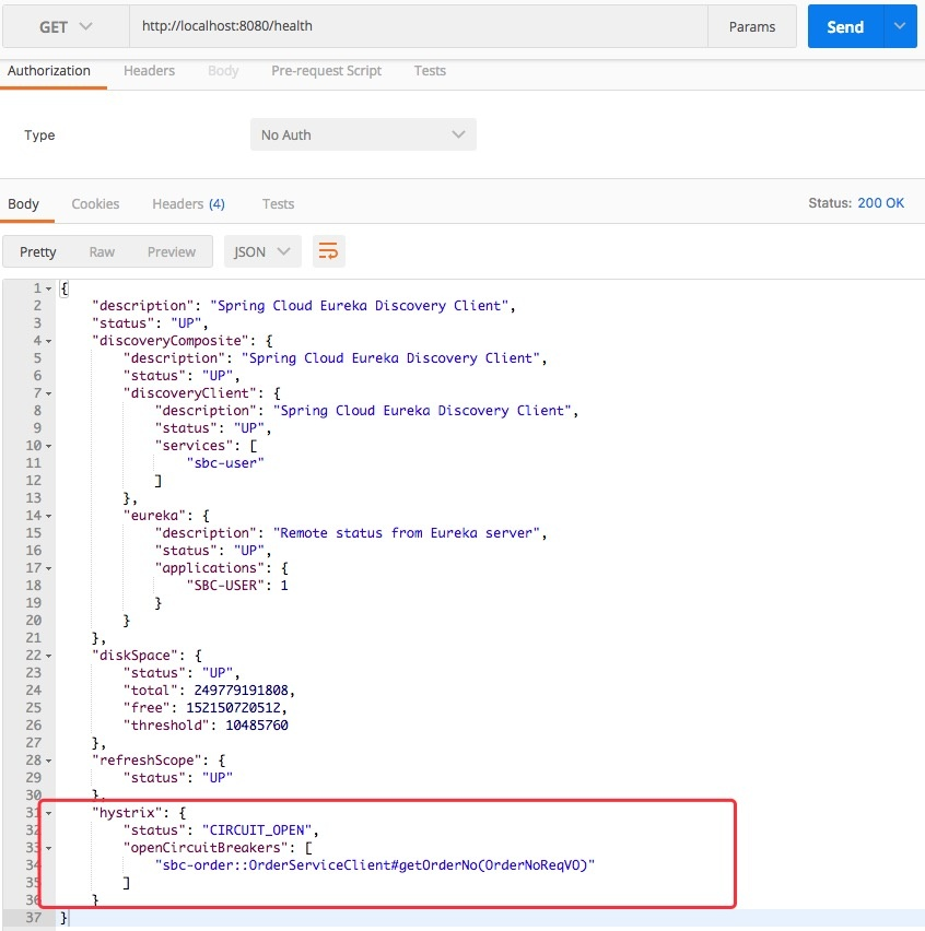 值得注意的是即便是执行了回退逻辑断路器也不一定打开了,我们可以通过应用的health端点来查看Hystrix的状态。
